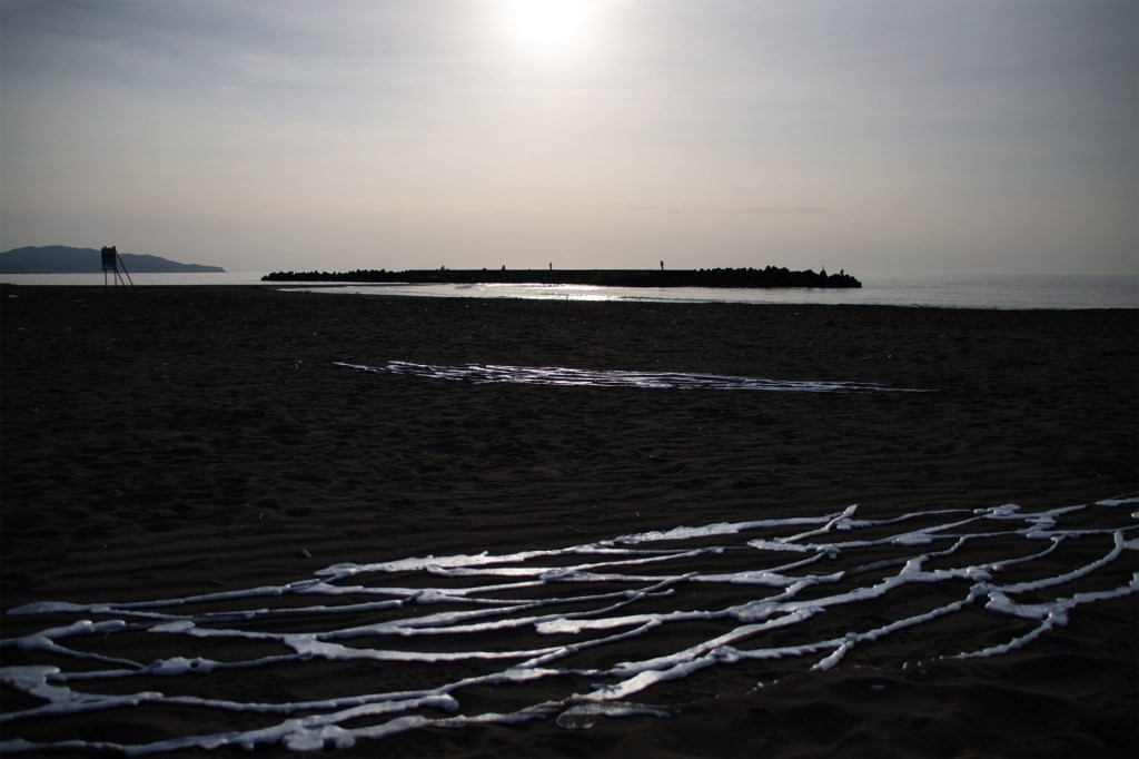 船見公園(新潟県上越市)の砂浜でアルミニウムを溶解し、ドローイングのように海の印象を形作った作品。