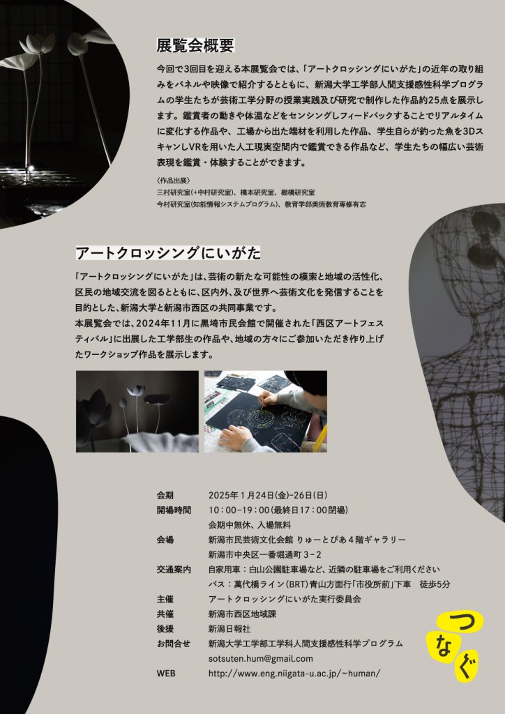 新潟市西区アートフェスティバルにて、新潟大学工学部人間支援感性科学プログラム「芸術プロジェクト表現実習」を履修した学生3組9名が、作品展示を行いました。(作品の一部として、ピューターの鋳造レクチャーを行いました。)